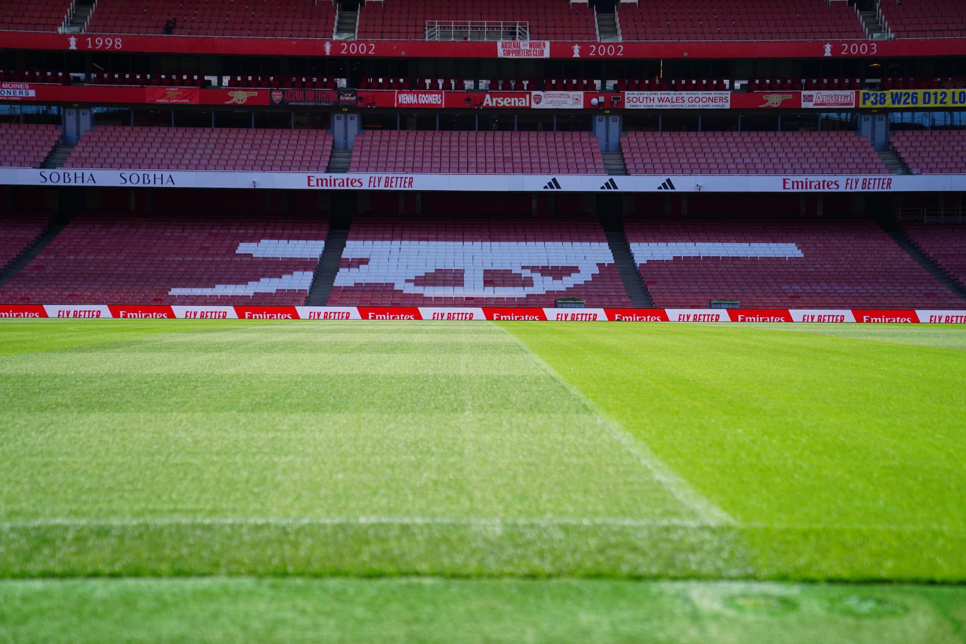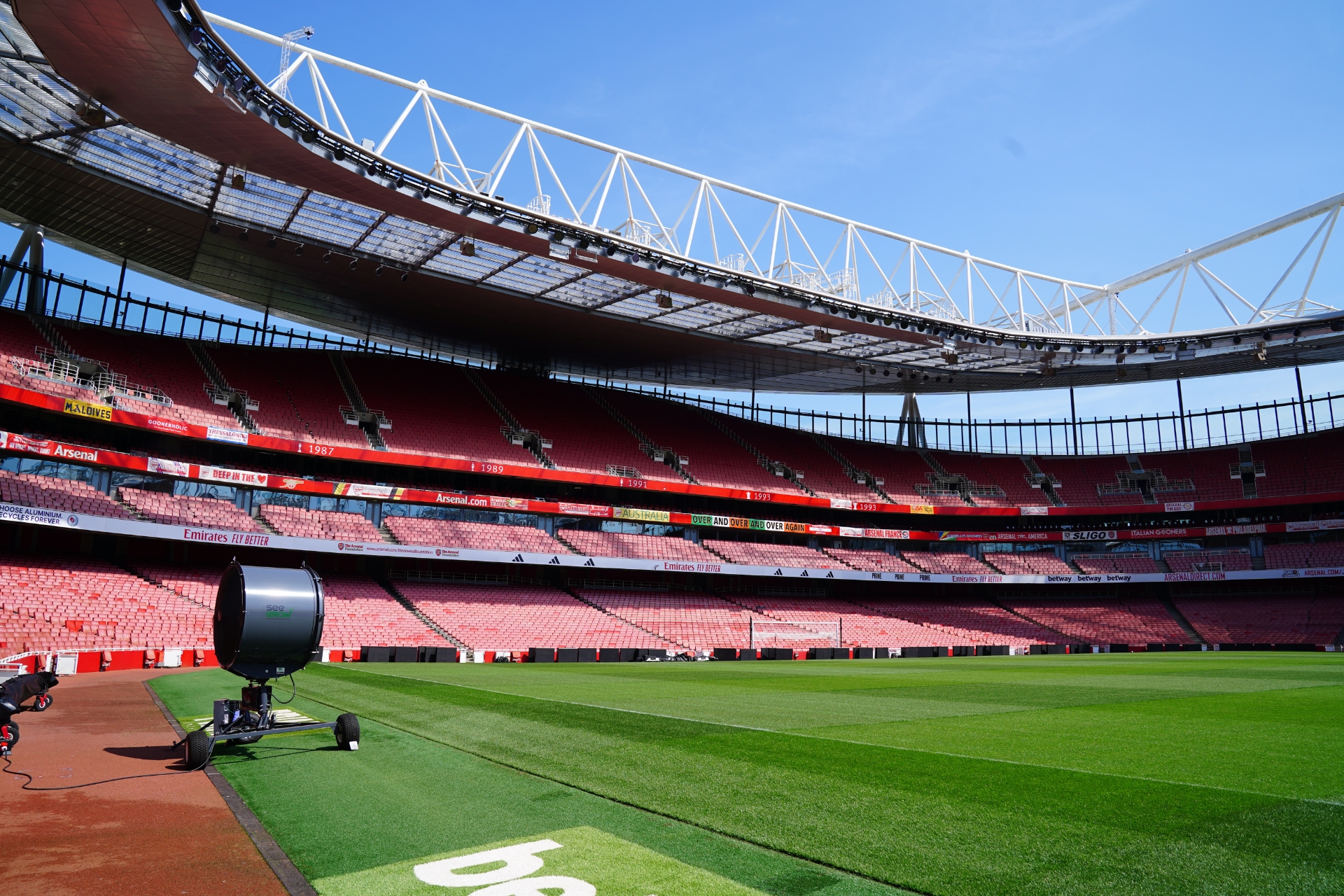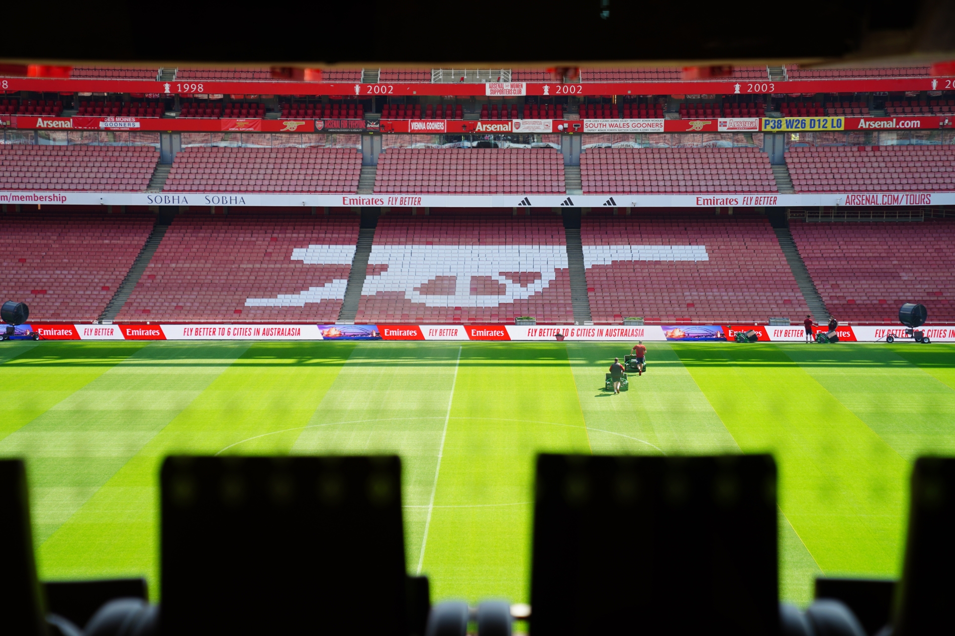 ส่วนฝั่งที่นั่งของอาร์เซน่อลจะมีผ้าคลุมไว้ ซึ่งเราสามารถเข้าไปนั่งถ่ายรูปได้เลย แต่อาจจะต้องต่อคิวกันสักเล็กน้อย เพราะจุดนี้ถือเป็นไฮไลต์ที่ใครมาทัวร์สนามก็ไม่พลาดที่จะถ่ายรูปกันครับ