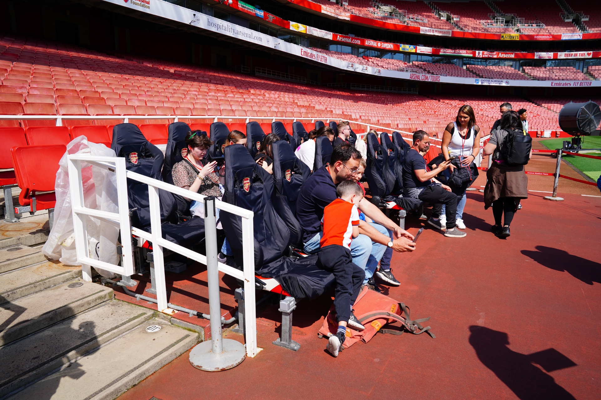 หลังจากนั้นเราจะออกมาบริเวณข้างสนาม ซึ่งเป็นจุดม้านั่งสำรองของนักเตะและทีมงานโค้ช โดยมุมนี้จะได้เห็นสนามในมุมมองเดียวกับ มิเกล อาร์เตต้า เวลายืนคุมทีมอยู่ข้างสนามในวันแข่งขันจริงเลยครับ