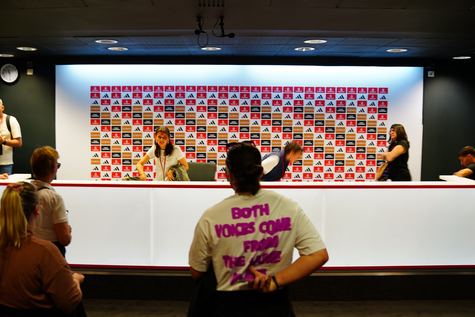 ก่อนจะไปยังจุดสุดท้าย เราจะผ่านห้องสัมภาษณ์หลังเกม ซึ่งเป็นอีกหนึ่งไฮไลต์ที่ใครมาทัวร์สนามก็ต้องแวะถ่ายรูปกันครับ และหลังจากจบทัวร์แล้ว เราจะวนกลับมาที่บริเวณร้านขายสินค้าของสโมสรอีกครั้งครับ